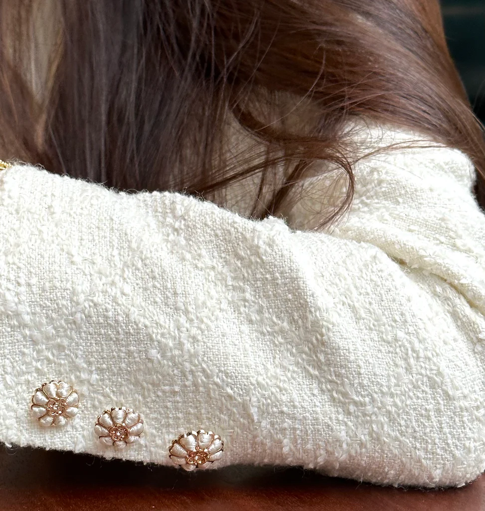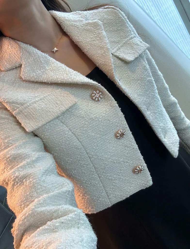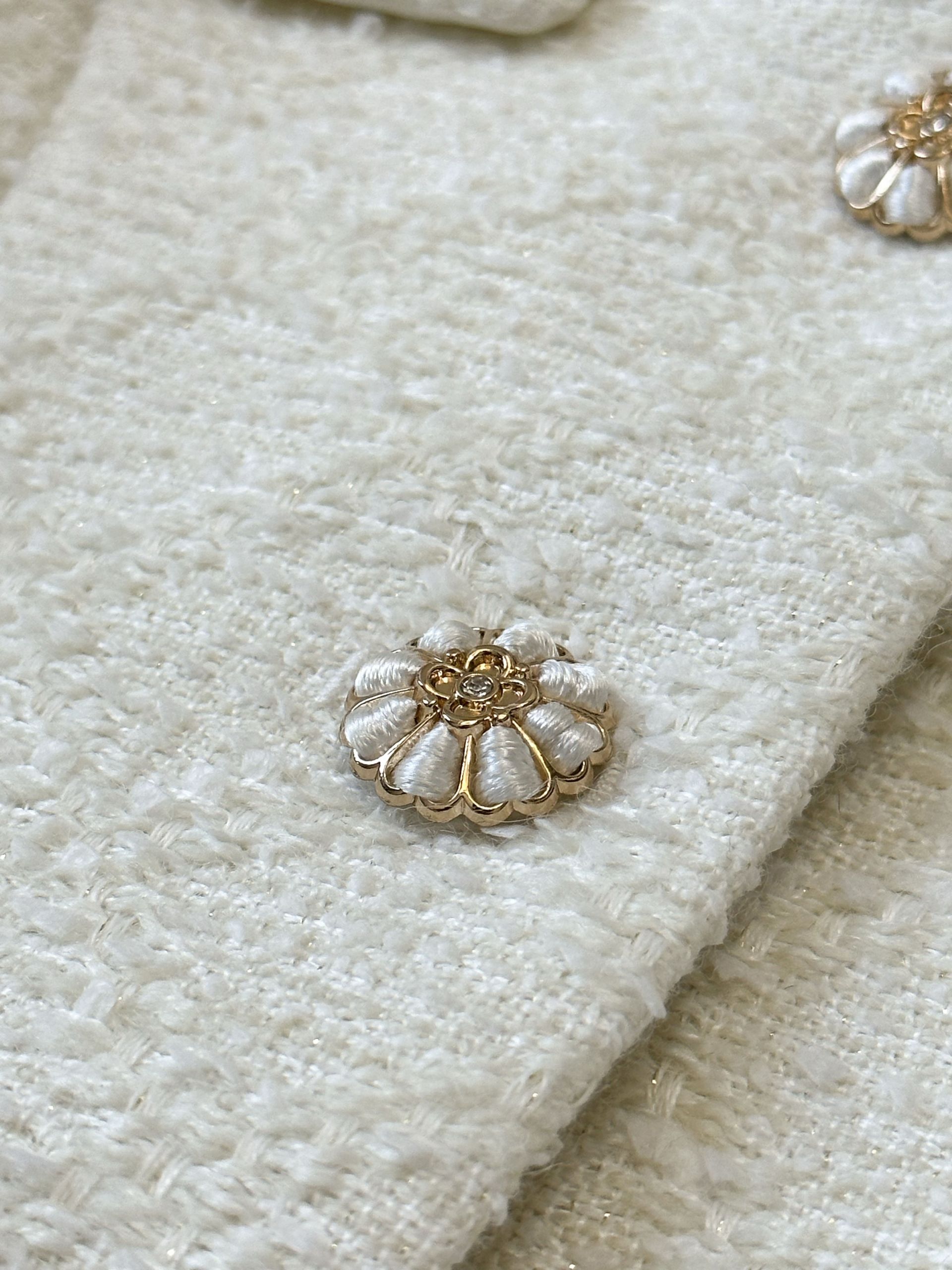 Featuring delicately crafted floral buttons, each embellished with intricate threading and a subtle central gem, these buttons elevate the jacket with a refined, high-end finish.
