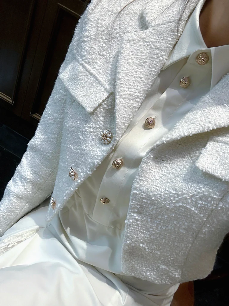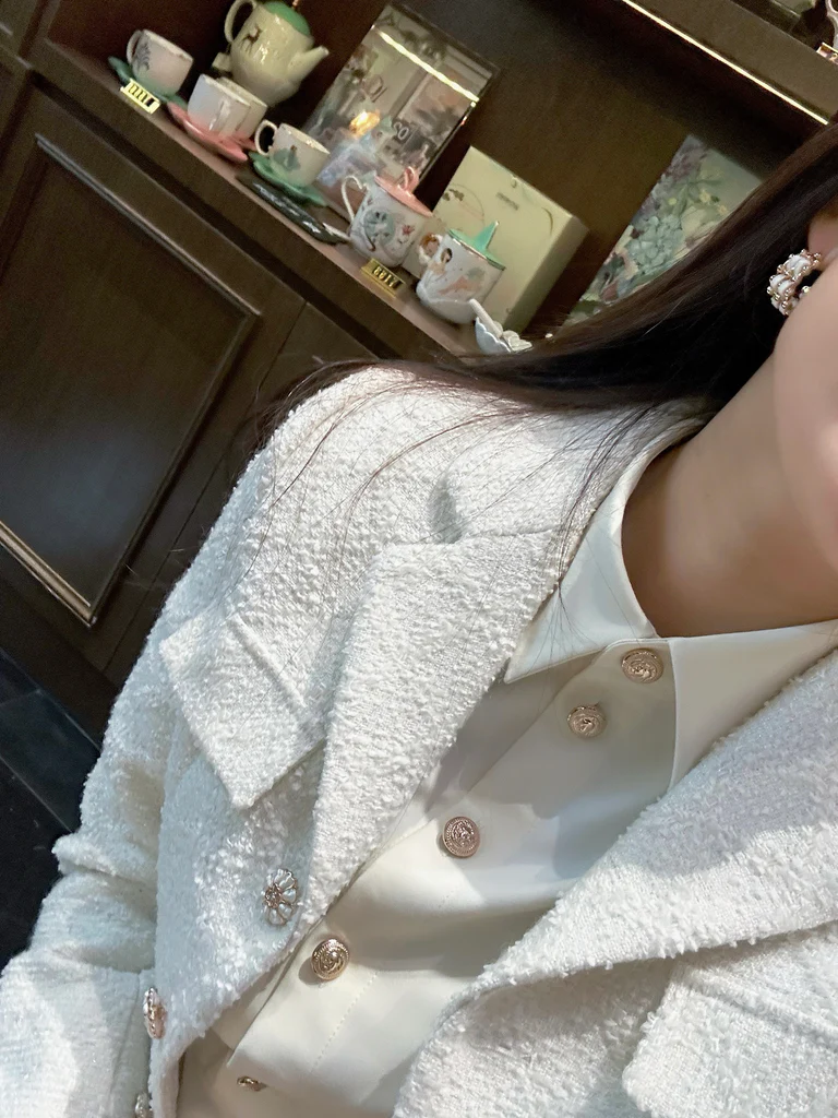 Crafted from premium tweed fabric blended with wool, this jacket provides extra warmth and a sophisticated texture, adding a touch of luxury to any outfit.
