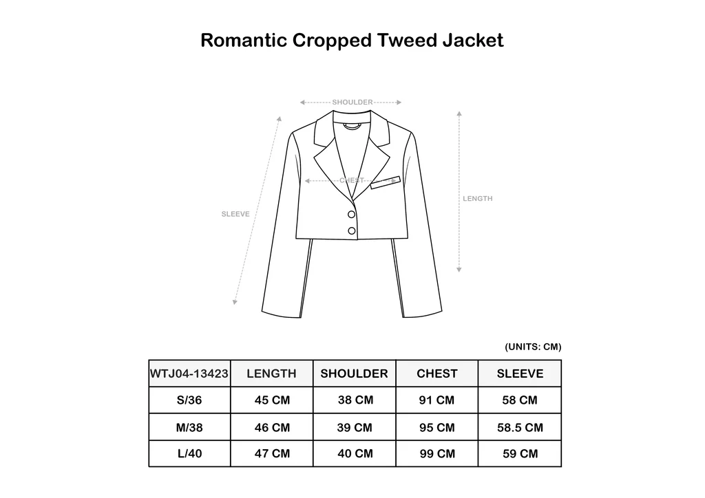 The Romantic Cropped Tweed Jacket features an exquisite texture and includes 10% wool, providing both warmth and style. Available in sizes S, M, and L, this jacket can also be custom-made to meet your specific needs. Its elegant cropped silhouette pairs perfectly with skirts, dresses, or trousers, making it a versatile piece for any occasion. The pearl-embellished buttons add a touch of sophistication, while the timeless tweed fabric enhances its luxurious appeal.