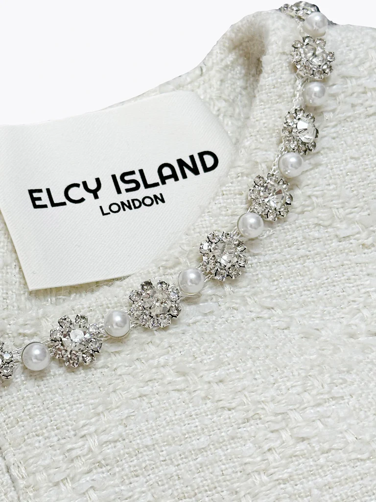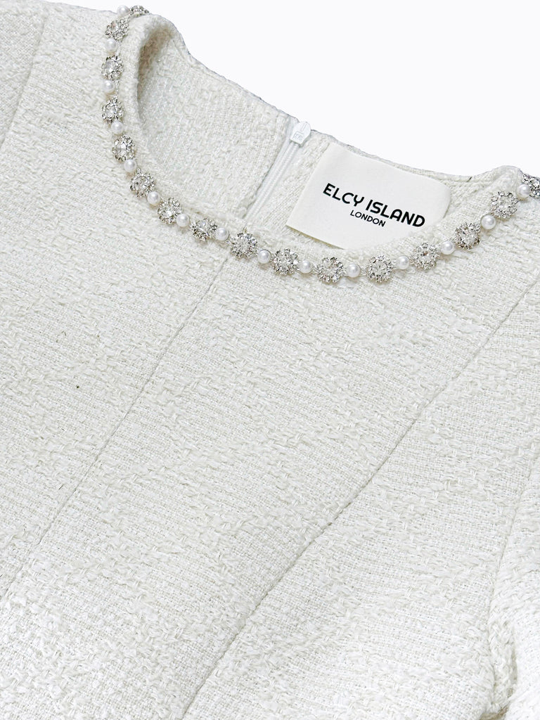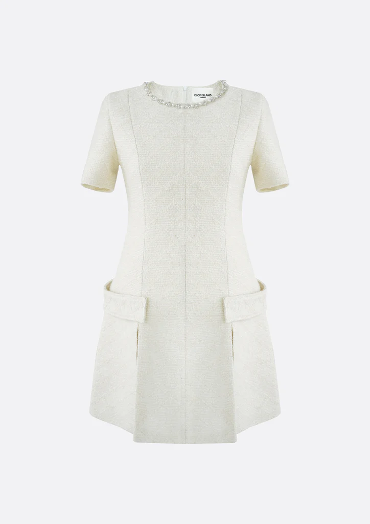 A timeless tweed dress with a crystal and pearl neckline, designed by ELCY ISLAND for elegant evenings or formal events. Its flattering silhouette and hidden lace details make it a versatile piece for any season.