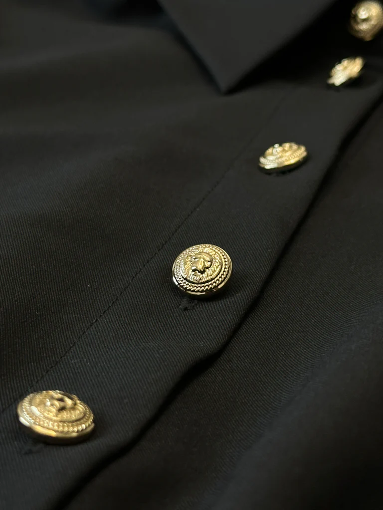 This chic mini dress features a sophisticated collar shirt design with striking gold button details. The gold buttons on the front of the dress add a touch of elegance and classic charm.