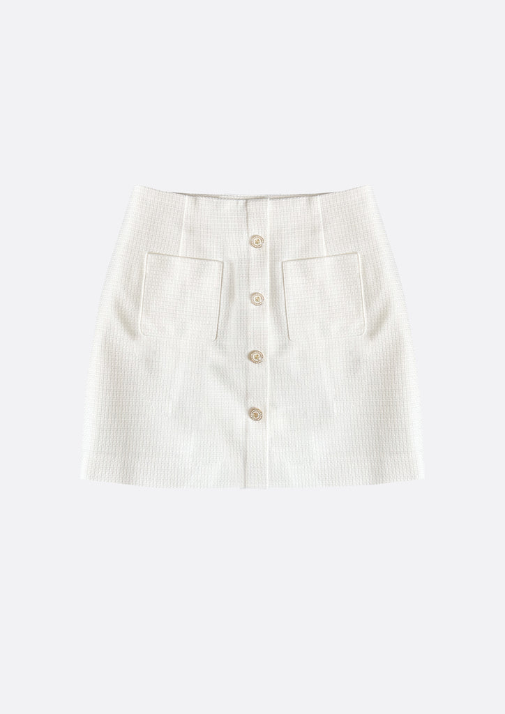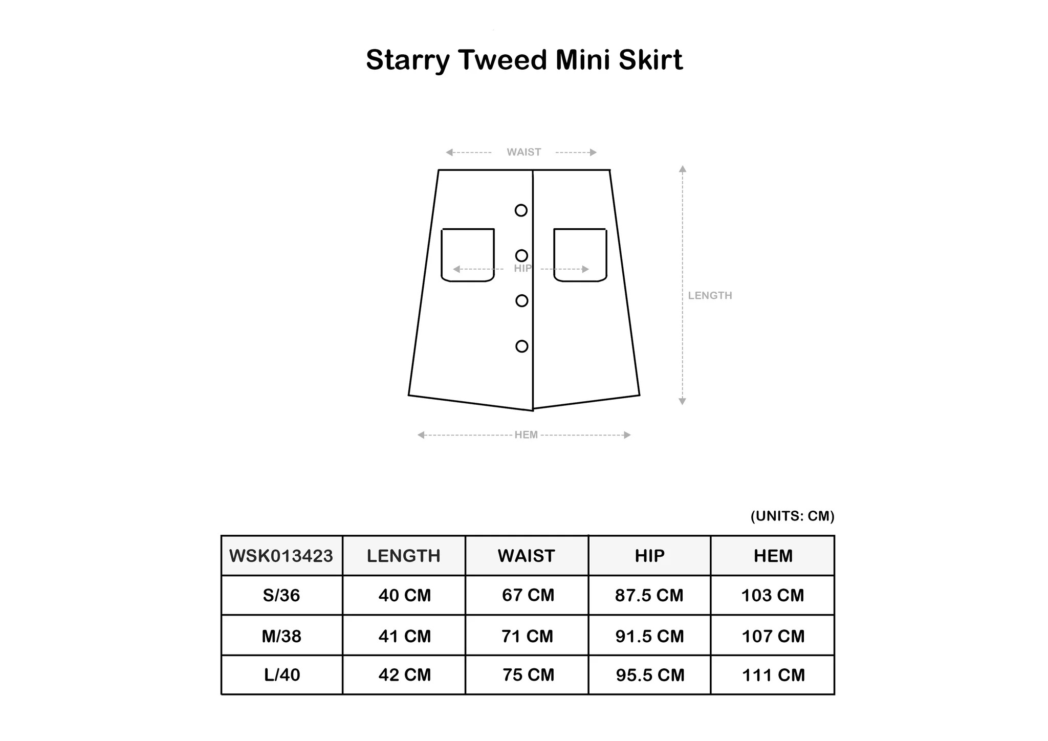 Featuring a slim fit and elegant details, including pearl buttons and minimal pockets, this skirt enhances your silhouette and adds a touch of sophistication. Pair it with ELCY ISLAND Starry Collar Tweed Jacket for a coordinated and stunning ensemble.