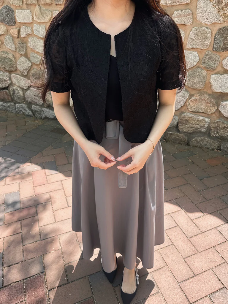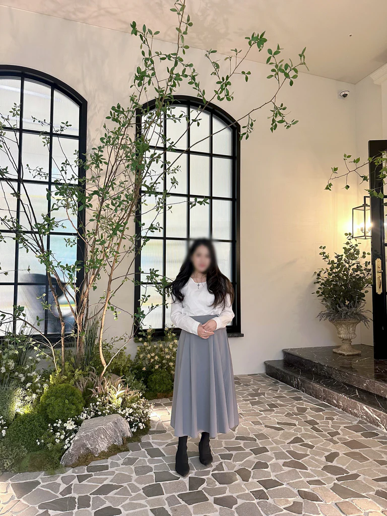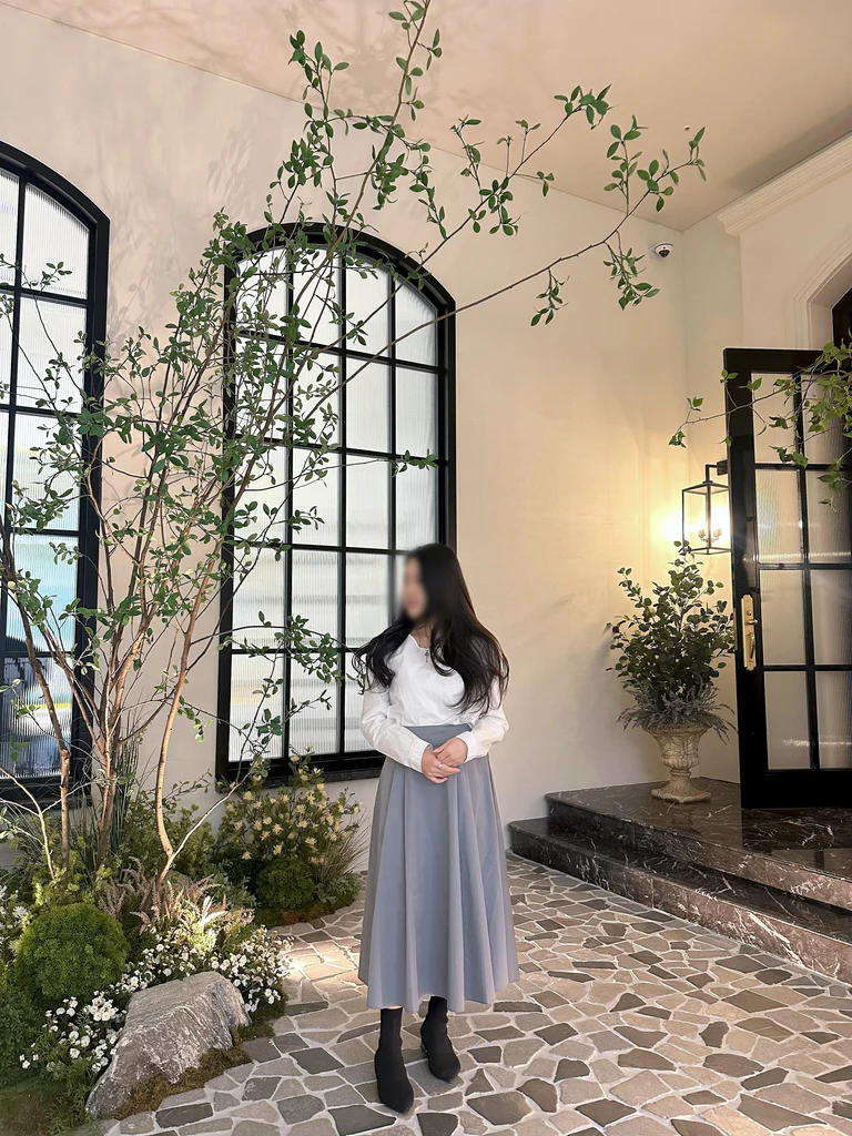 Crafted from lightweight, softly flowing fabric, this skirt features a voluminous A-line silhouette that brings graceful movement to every step.