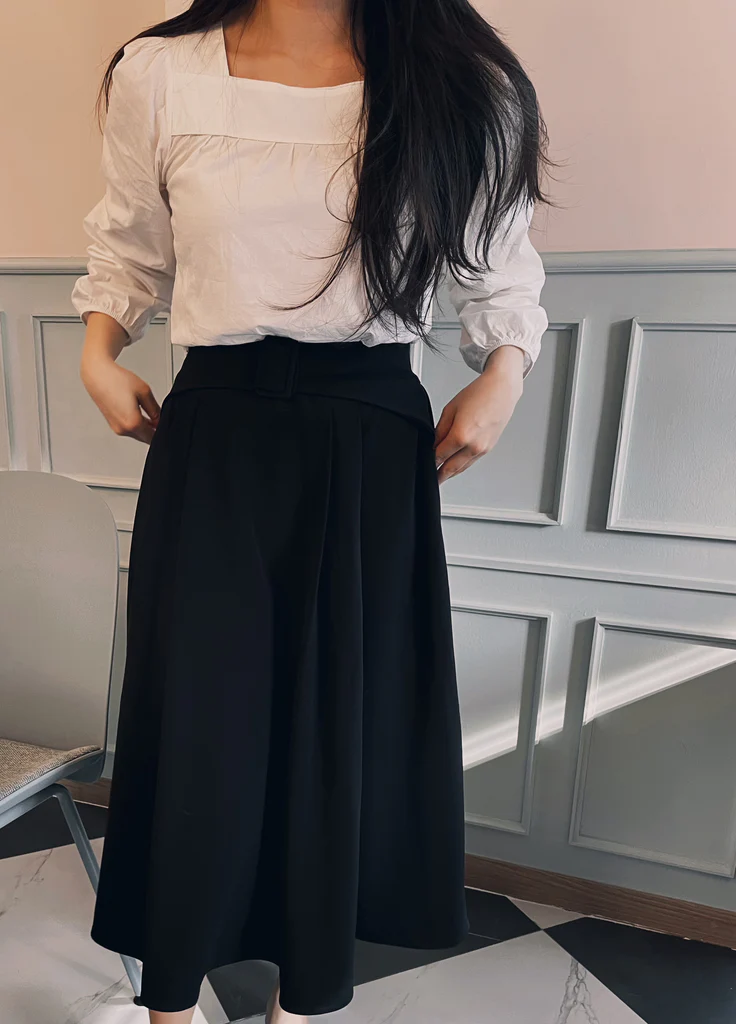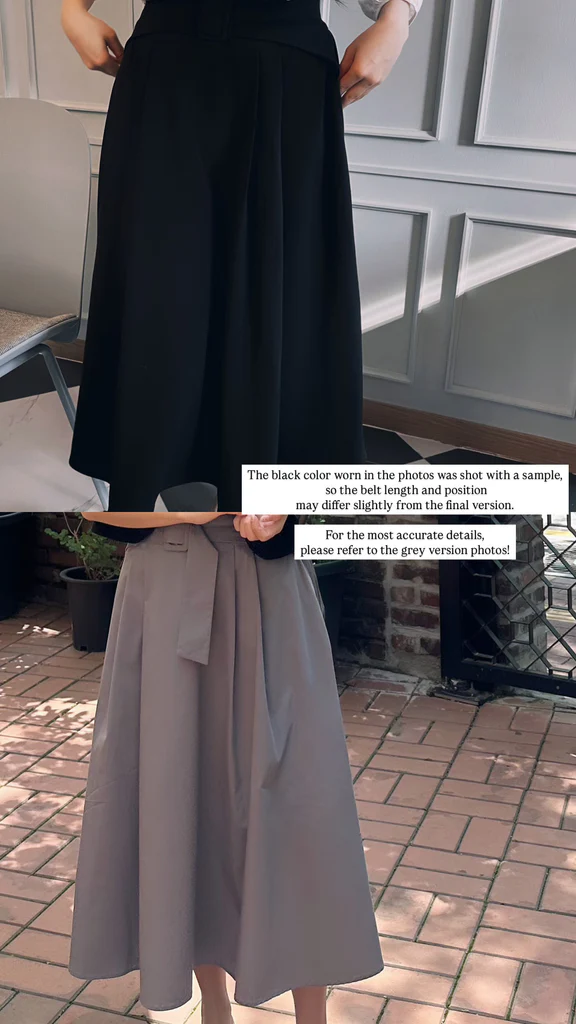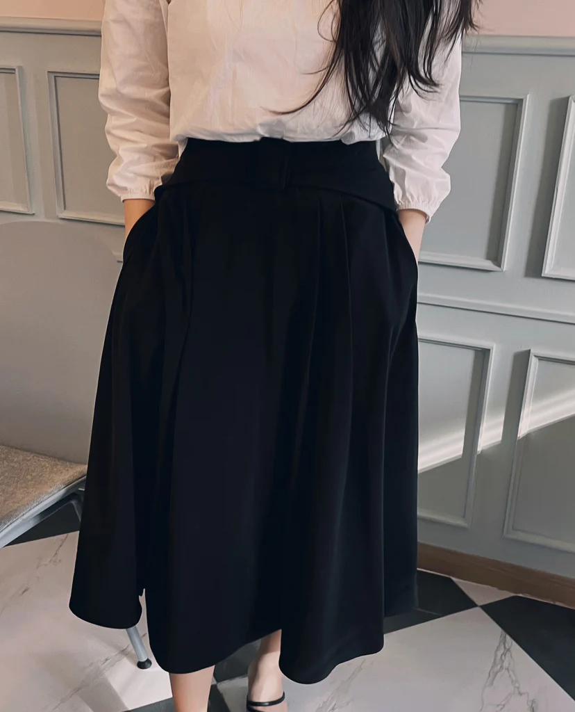 A timeless A-line skirt that blends classic elegance with unique details. Designed with a graceful, voluminous silhouette, this skirt enhances femininity effortlessly. The front features refined pintuck details, while the back showcases soft pleats and a belt accent, adding a stylish twist.