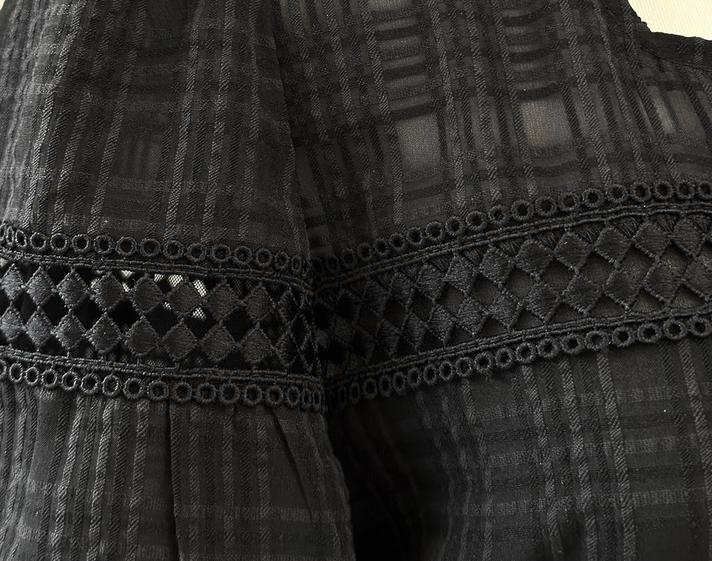 Crafted with meticulous care, the check fabric was carefully selected for its soft sheen and wrinkle-resistant texture. Each lace check line has been aligned through 1:1 pattern work and hand-cutting to ensure flawless symmetry.