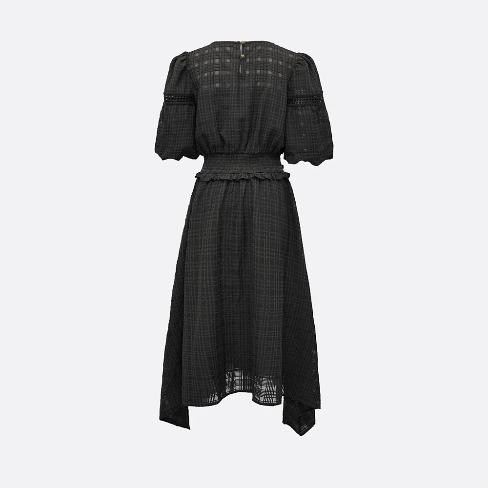 The Elara Unbalance Check Dress is where delicate femininity meets comfort-driven design. An asymmetric midi dress crafted from a delicate check fabric with a subtle sheer finish. The gently cinched waist enhances the silhouette while the softly pleated skirt and unbalanced hem create a graceful yet modern feel.
