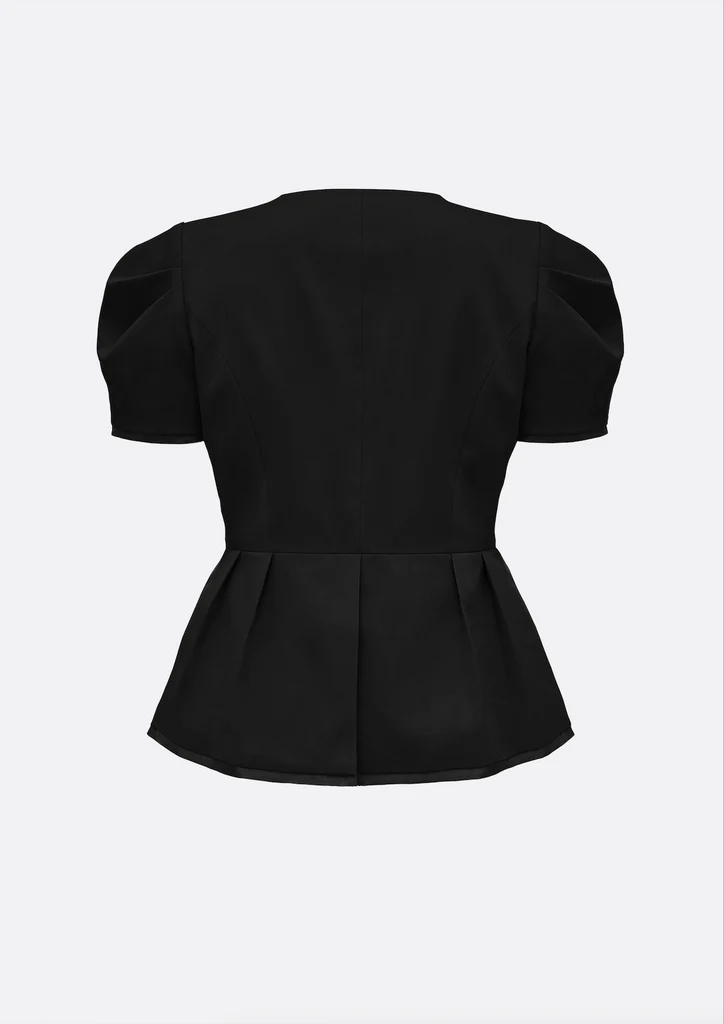Crafted from a luxurious wool blend and elevated with subtle organza details, it features voluminous puff sleeves and organza-trimmed cuffs that enhance both lightness and refinement.