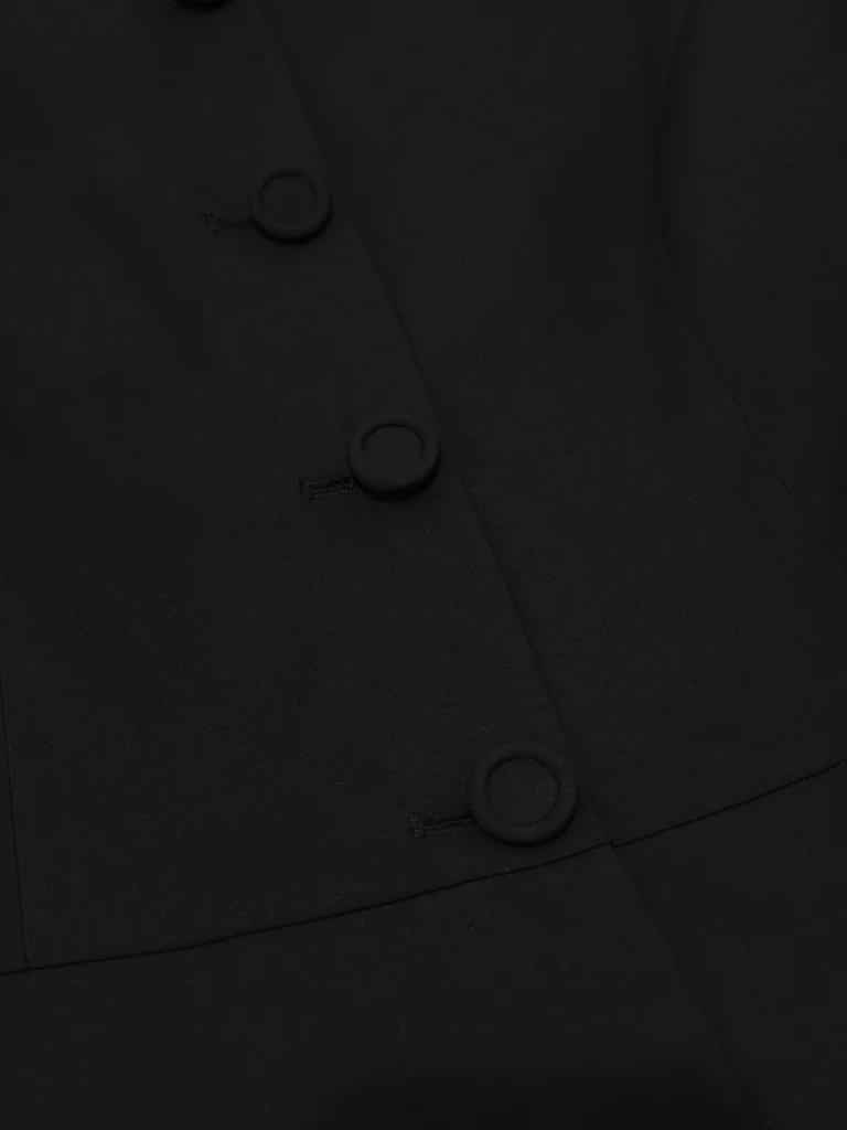 Fabric-covered buttons enhance cohesion and elevate the jacket’s polished finish.
