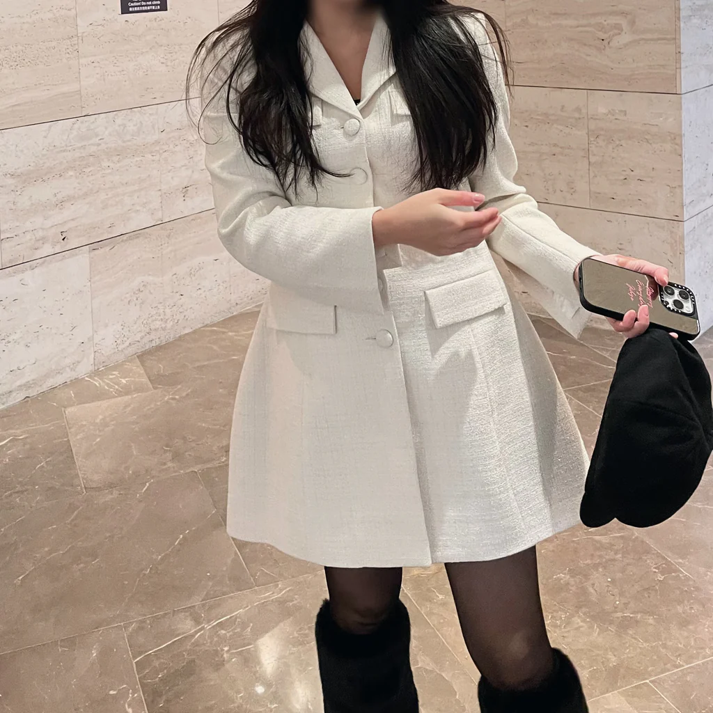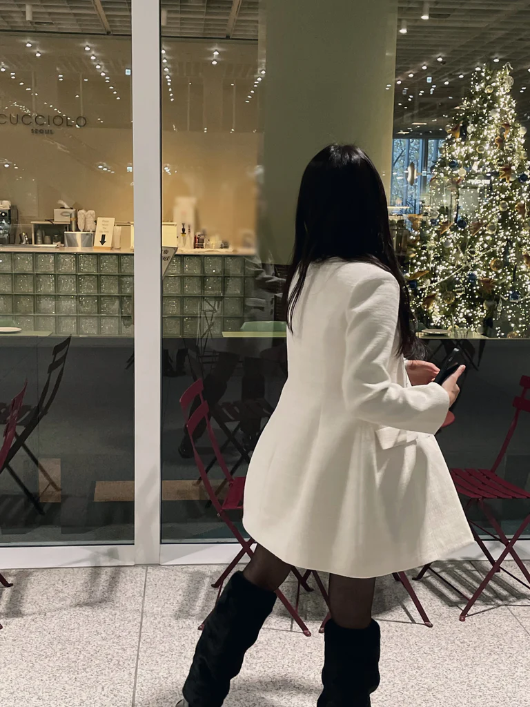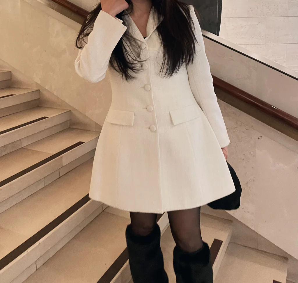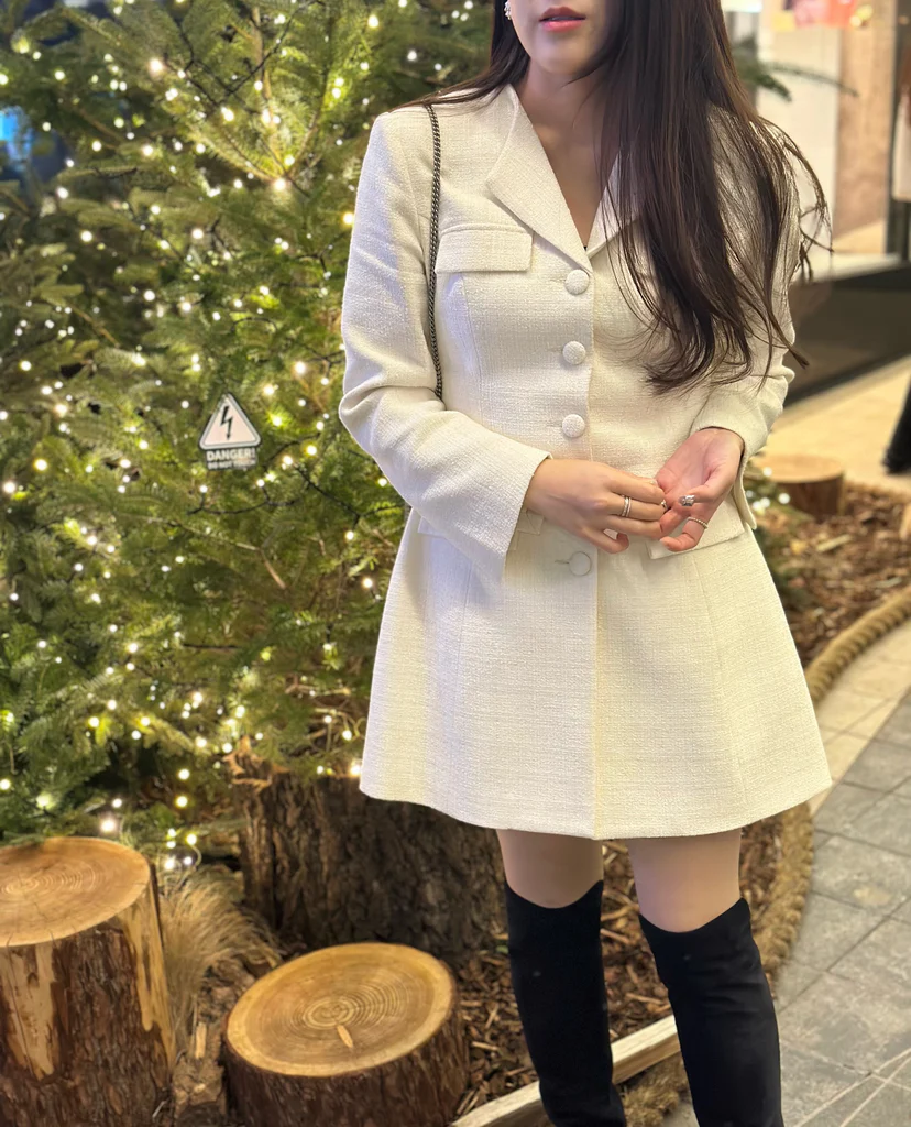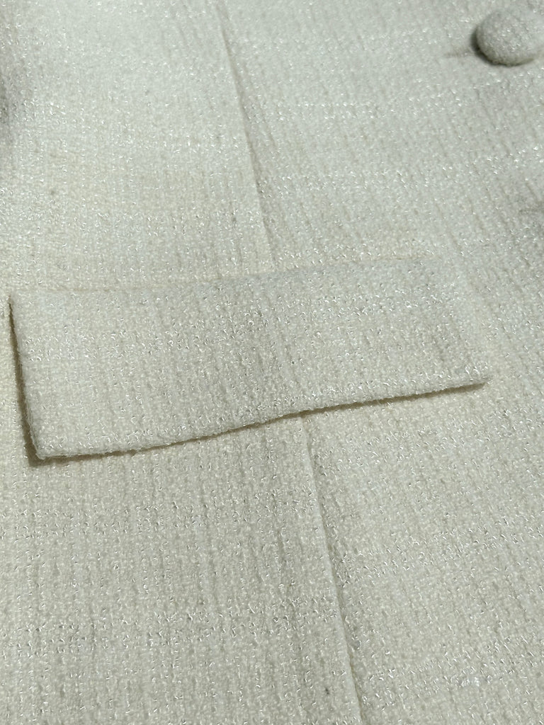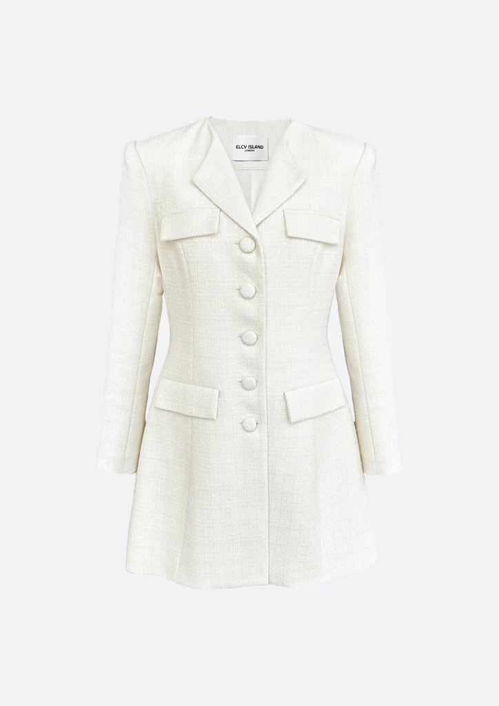 Crafted to highlight the feminine figure, the Hourglass Tweed Jacket is a masterpiece of structured design from ELCY ISLAND. Designed with a flattering hourglass fit, it accentuates the waist while gracefully highlighting the hips for an elegant and sophisticated silhouette. Whether styled as a chic dress or an elegant jacket, this versatile piece offers timeless charm. Pair it with tailored trousers or a matching skirt to complete the look—a true must-have addition to your wardrobe.