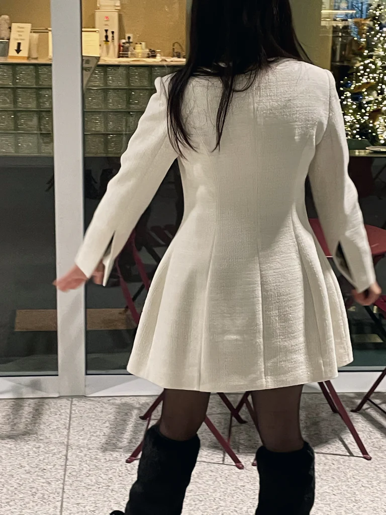 The structured fit, combined with the A-line skirt, exudes timeless elegance and charm,
